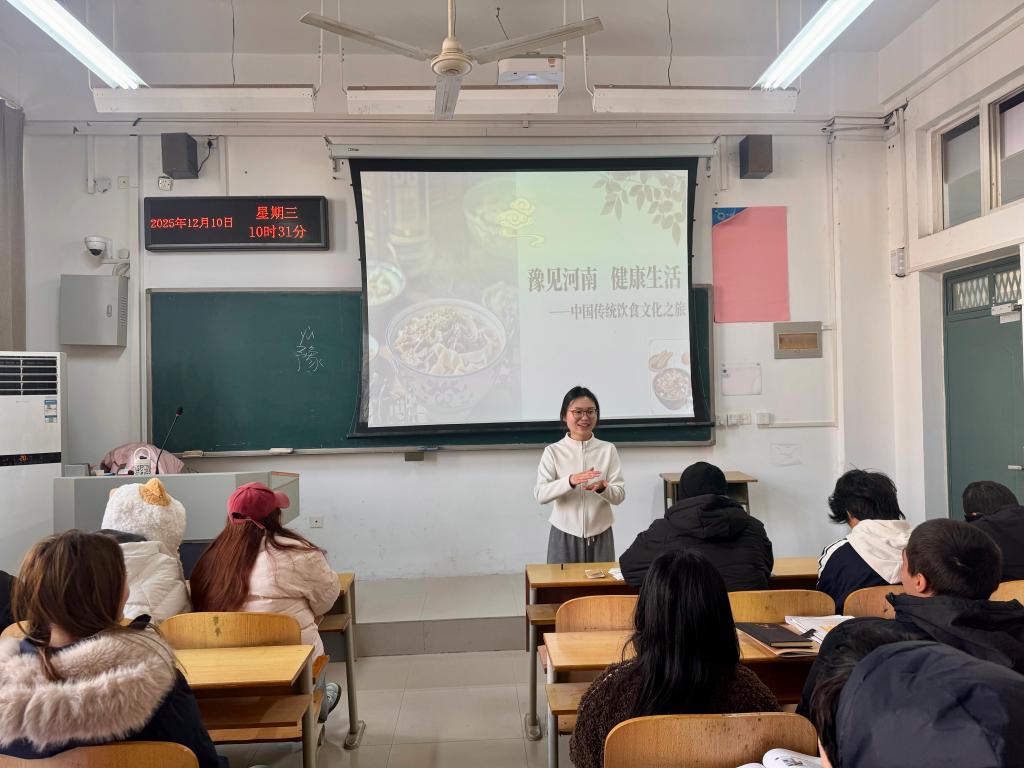 活动伊始,职工辅导员张彤用通俗易懂的语言解释了中国传统饮食文化中蕴含的“药食同源”“平衡有度”的健康智慧,强调饮食不仅是能量补给,更是顺应时节、调理身心的生活艺术。随后,来自不同地方的中国员工代表化身“家乡美食推荐官”,生动形象地介绍了具有代表性的河南美食。从汤鲜味醇、暖胃驱寒的胡辣汤,到面条筋道、汤底浓郁的烩面,每一种美食背后都藏着独特的地域文化。紧接着,职工分享了他们在河南吃到的心仪美食,以及他们眼中的健康饮食。在交流环节,师生们围绕美食与健康主题展开讨论,分享不同饮食观念,共话健康生活方式。